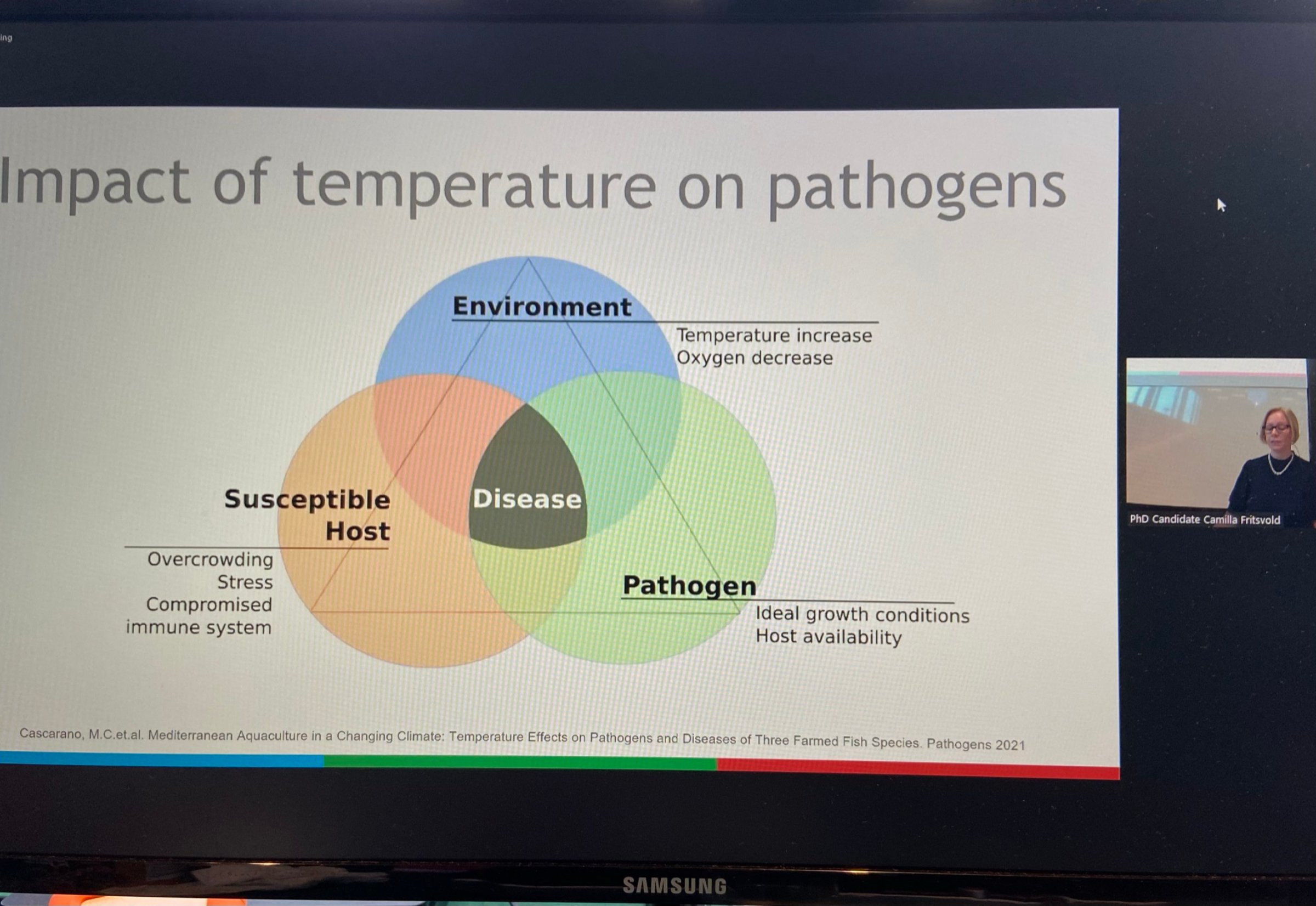 Fram til 2010-2011 var årsaken til sykdommen ukjent, med mange ulike hypoteser. Studien hos Camilla var tredelt. I den første presenterte hun og hennes kolleger resultatene fra det første vellykkete smitteforsøket som viser at CMS er en smittsom sykdom. De injiserte uvaksinerte post-smolt av Atlantisk laks med vevshomogenat laget av hjerte- og nyrevev fra stor oppdrettslaks med CMS. Forsøksfisken utviklet hjerteforandringer i tråd med tidligere beskrivelser av CMS i stor oppdrettslaks. Tross en svært lang observasjonsperiode på 42 uker, holdt både forekomsten og alvorlighetsgraden av hjerteforandringene seg jevnt høy, og det ble ikke sett tegn på tilheling av skadene.